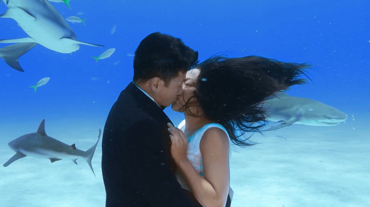 影/新人挑战惊险度爆表「鲨鱼婚礼」 鲨鱼直接迎面冲来让人捏一把冷汗!