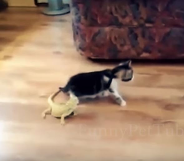 影片一开始,小猫咪对于家中的两只鬣蜥相当好奇,不断的想用手手去摸摸牠们,甚至还「动嘴」咬牠的尾巴,被猫咪玩弄的鬣蜥只好向前爬行,想躲避这只小猫咪的好奇心,但是猫咪当然不会这么容易放弃眼前的小玩具,紧跟着鬣蜥晃动的尾巴,连人家已经走远了,眼神还紧紧盯着不放。