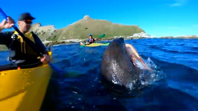 最近在紐西蘭南岸有一群遊客正在華著香蕉船出遊,大家笑得非常開心,大家享受著陽光的沐浴和海水的沁涼,想不到這時候卻有個威脅一步一步地正在接近他們。忽然從他們船旁邊的海面上出現了一團不知道是什麼的東西,此時這團謎樣的生物忽然「攻擊」了他們!