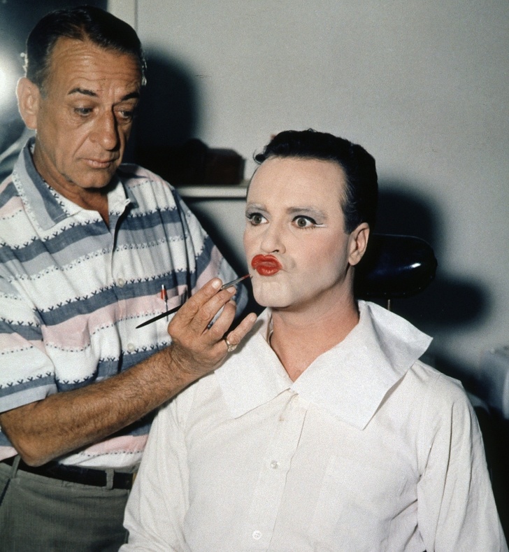 2. 傑克·李蒙 (Jack Lemmon) 在後台化上濃妝的樣子。
