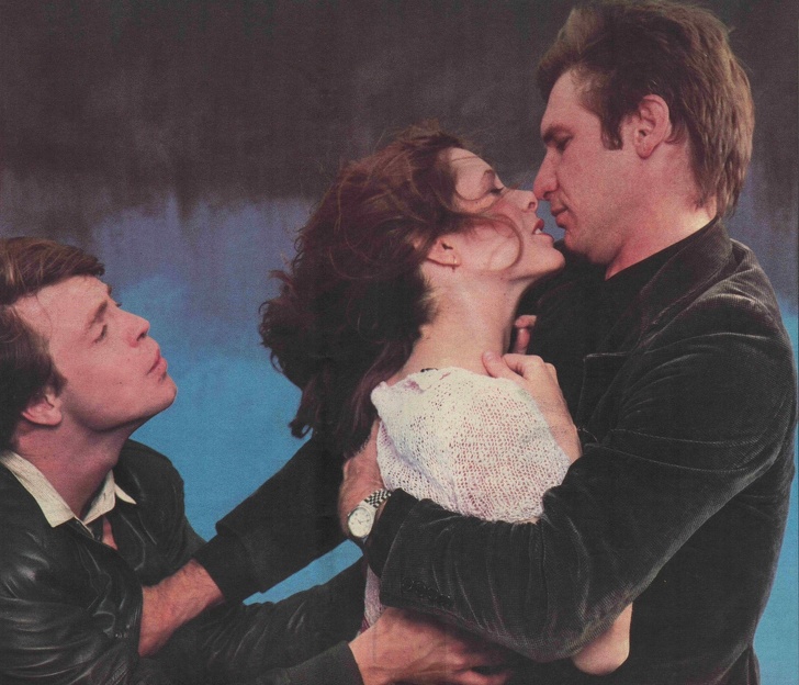 7. 馬克·漢米爾 (Mark Hamill)、嘉莉·費雪 (Carrie Fisher) 和哈里遜·福特 (Harrison Ford) 在《星際大戰》片場。