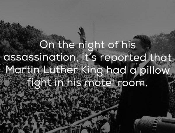 12. 「在馬丁·路德·金被暗.殺的那晚,據説他在飯店房間有一場『枕頭大戰』。」