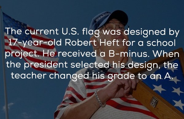 16. 「現在的美國國旗其實是由當時才17歲的Robert Heft在學校設計的。當時,他只有拿到『B-』的成績。但當總統選了他的設計後,他的老師馬上把他的成績改成『A』。」
