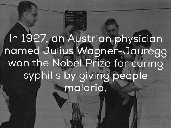 19. 「在1927年,一位奧地利醫生Julius Wagner-Jauregg因為用瘧.疾治療梅.毒而獲得諾貝爾獎。」