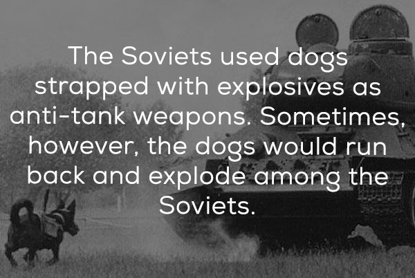 9. 「蘇聯曾經在狗狗身上裝炸.藥,這樣就可以不用坦克就能夠引.爆。但有時候,一些狗狗會跑回來把蘇聯軍隊們炸.掉。」