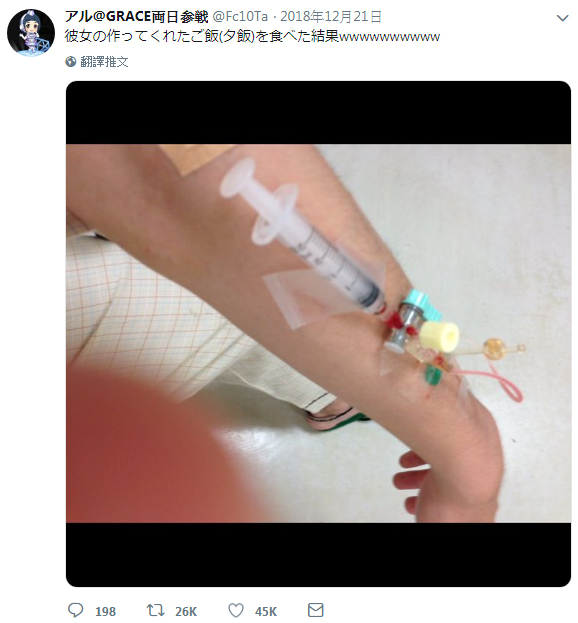 這麼可怕的女友,男生真的要小心啊!在推特上就有名日本男網友表示,有一天他吃了女友煮的晚飯,原先聽起來是很甜蜜,也會讓不少人羨慕的事情,只是吃沒多久後整個人卻昏倒了過去,醒來時已經在醫院打針治療中,原先以為是自己太累還是女友做菜太難吃,結果才發現原來是個可怕的陰謀。
