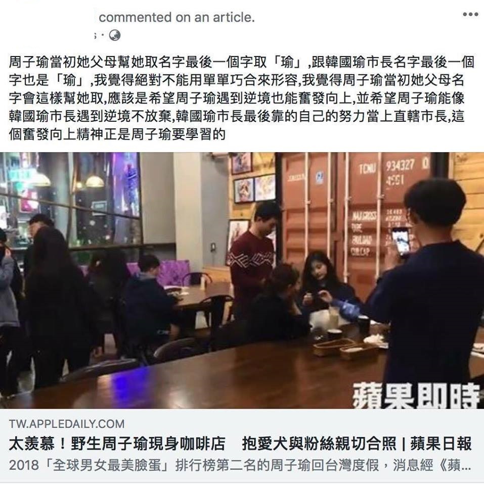 從粉絲專頁發文的截圖裡面,我們可以得知,這是一位韓粉轉發周子瑜的新聞並寫道,「周子瑜的父母當初幫她取名字時,最後一個字用『瑜』,跟韓國瑜市長的『瑜』一樣,我覺得絕對不能以單單巧合來形容,她父母應該也是希望周子瑜遇到逆境也可以奮發向上,就像韓國瑜市長在逆境中也不放棄,最後靠自己的努力當上市長,這種精神正是周子瑜要學習的!」。