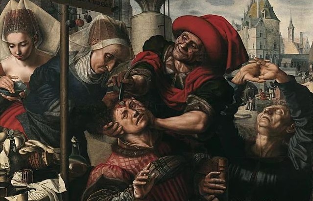 於是修道院的神職人員們開始找會用刀的人來執行這些療法,像是理髮師或是屠夫。而畫家彼得·勃魯蓋爾當然也是用畫來紀錄這些愚蠢的行為,我們可以從《取出愚者之石》這幅畫中看到,被開腦的人表情有點麻木,感覺好像有被施打了麻醉一般。