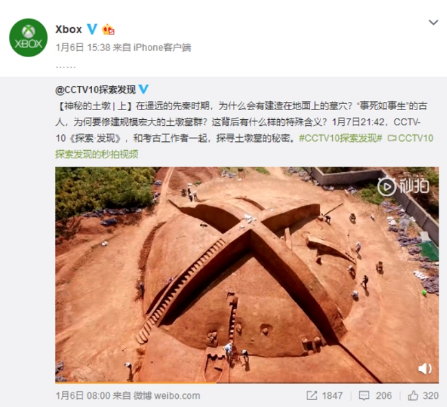 這座土墩被發現後,考古學家們也開始挖掘和探勘,在其中出土了許多原始瓷和陶器,經過鑑定後,發現這些文物應該是商周時期的器物,另外在進一步考古後,確定這座土墩就是商周時期所建造的墓沒錯。只不過就有網友發現,這個隆起的圓形土丘上出現了一個巨大的叉叉,其中一邊還有著階梯可以行走,當網友看到這個畫面後,直呼這個外型也太像微軟XBOX的LOGO,幾乎可以說是神複製。