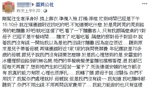 原PO表示当他在吃面的时候,听到这对母子在谈论「没有钱」的事情,原先他以为他们只是在说没钱付给面摊,之后才知道原来是儿子带着看起来70多岁的老母亲在殡仪馆附近询问丧葬费用,但每家都因为太贵,让老母亲无奈说,「我们没有钱要怎么办。」母子2人看起来非常苦恼。