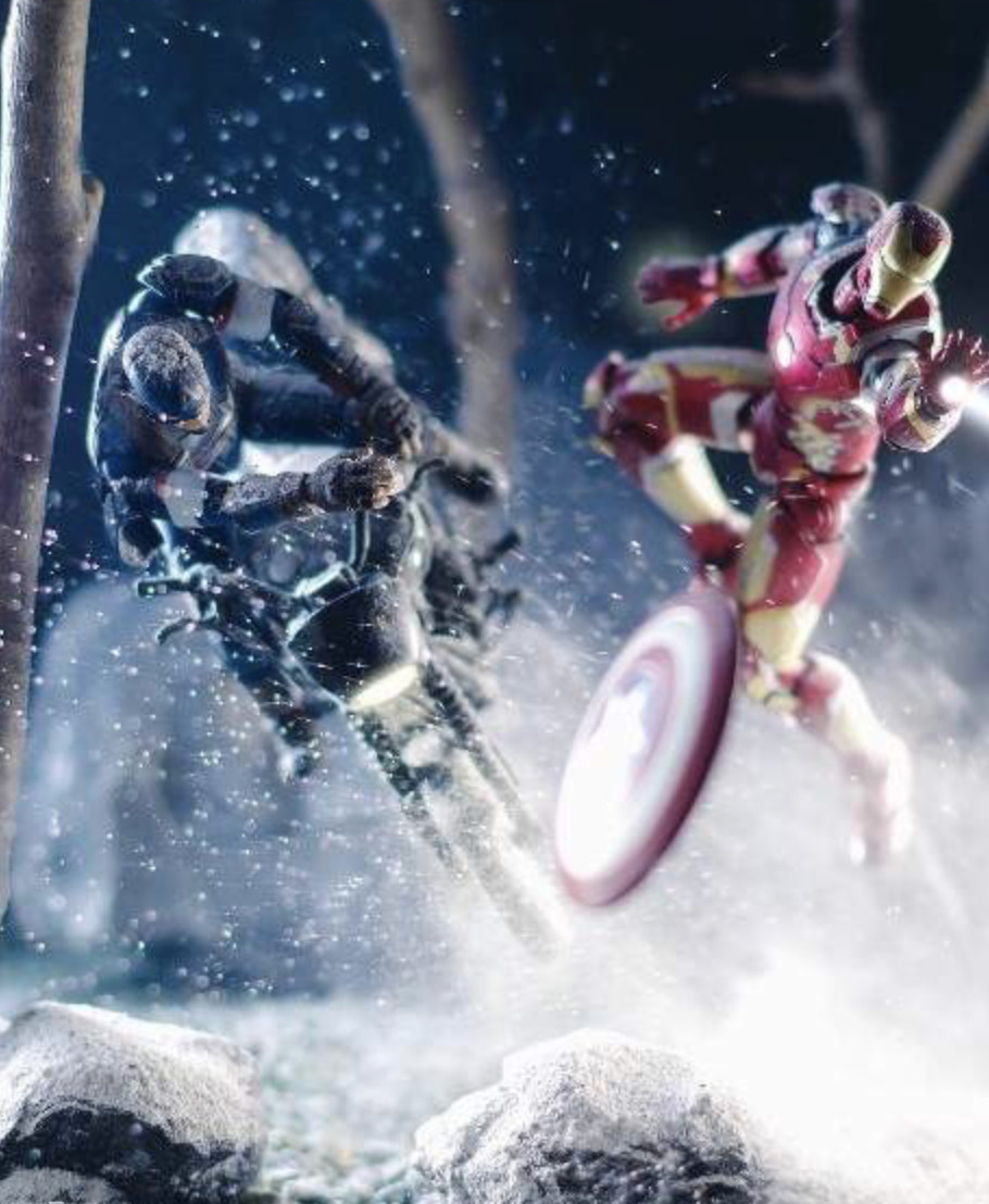 3.美國隊長跟鋼鐵人的雪地征戰照:這張照片非常講求按快門的時機!利用水花激起粉末的方式就可以呈現出類似的作品,但重點是「技術」!