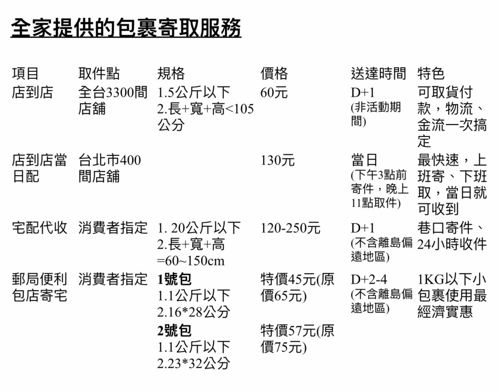 目前全家的店到店配送,限制是在长+宽+高<105公分,且重量5公斤以下的货物,寄件价钱为60元;至于邮局便利包的话,因为是在开办初期,因此至少前3个月的时间有优惠的活动,16×28公分的1号便利包优惠价为45元,23×32公分的2号便利包优惠价为57元,不过不管是哪个尺寸,重量都不能超过1公斤,虽然说可以寄送小东西也比较经济实惠一点,但是就无法像店到店一样最快当天送达,只能说寄件者需要评估自己的需求再去做选择喔!