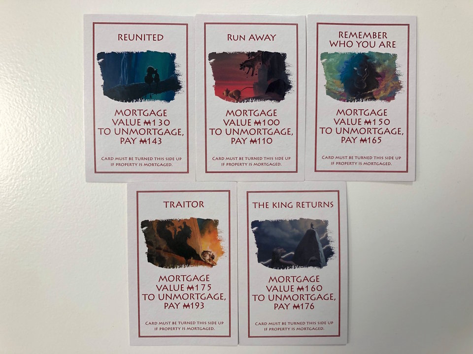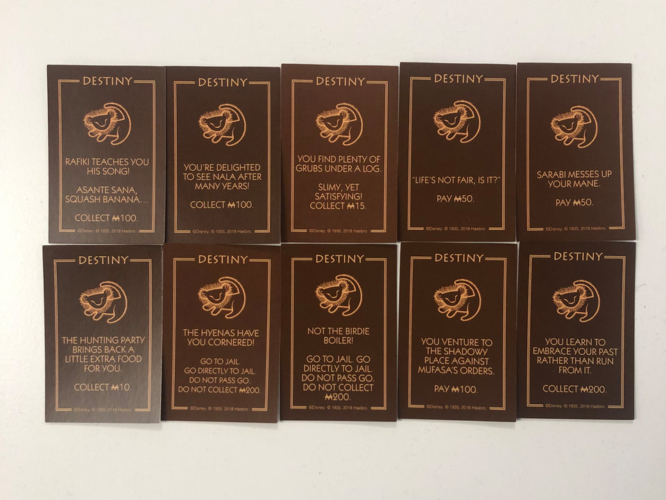 如果你是《獅子王》的忠實粉絲,每張命運卡都會讓你想起電影中的某個場景,會讓你對這部經典電影有點懷念。例如,有一張上面有刀疤台詞的卡片,寫著「人生就是不公平,對吧?(Life’s Not Fair, Is It?),要求玩家向銀行支付50美元的壟斷資金。(感覺好好玩阿)