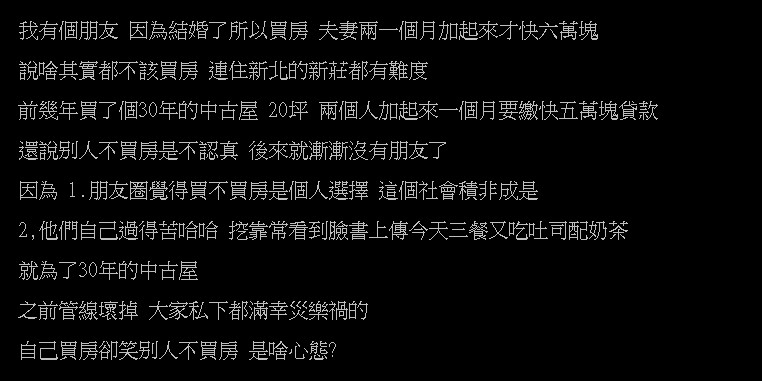网友表示,朋友买房后,一直自称自己是「人生胜利组」,已经不再是鲁蛇组,他们也劝大家赶紧买房。原PO说:「买不买房应该不需要由他们来定义,如果一个月没有个10几万谁敢买房,也不知道这自信心是打哪来的。」因为不想听这对夫妻一直往脸上贴金,所以朋友们一个个离他们远去,
