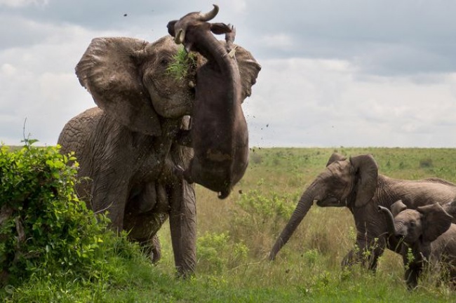 12. 大象媽媽保護孩子不受水牛攻擊的瞬間。