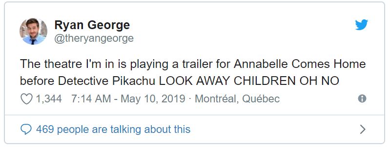 沒錯這真的發生了,一名外國媒體人Ryan George日前就在推特上表示自己遇上了這個超好笑的情況,並在推特上說:「我正在看新上映的《名偵探皮卡丘》,可是電影前的預告片居然播了《安娜貝爾回家囉》,附近的小孩都快嚇壞了。」