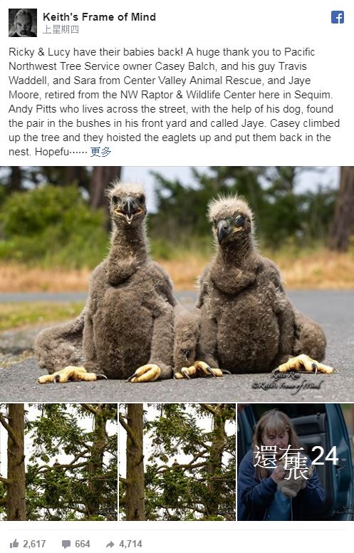 基斯是一位野生動物攝影師,他經常都會把自己拍到的各種動物照片放到臉書上跟大家分享,而近期他也把被譽為「美國國鳥」的白頭海鵰幼鳥照放上網,表示這兩隻幼鳥從巢裡摔落出來,經由人們的幫忙之下成功把牠們送回鳥巢,整個過程相當感人。