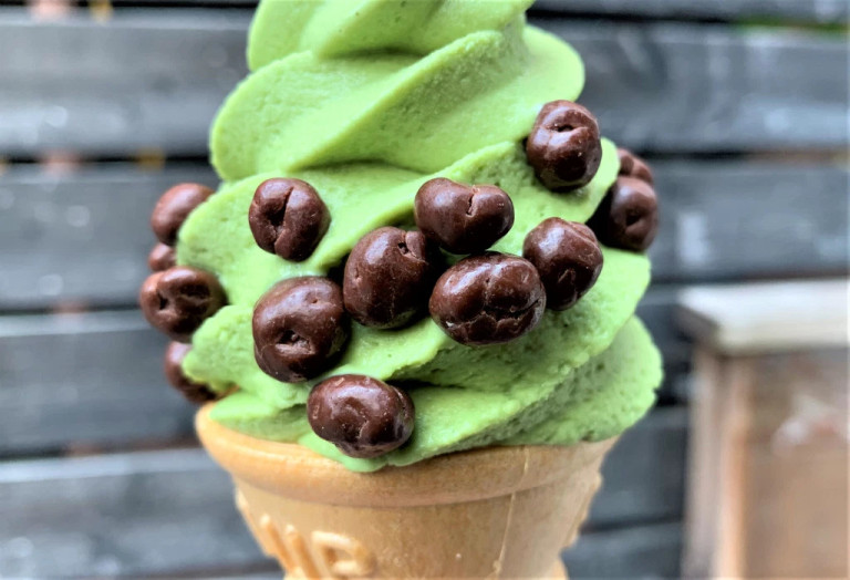 最近奈良公園附近有家小吃攤在網路上爆紅,就是這一家位於地鐵奈良站和奈良公園走過去路上的小吃攤Daibutsu Ichigo,為什麼呢?因為最近他們推出了一款超級有設計感的冰淇淋,就是「鹿屎冰淇淋」啦。這一款冰淇淋的基底是使用了抹茶口味的冰淇淋,上面會放一些巧克力豆來增加「視覺衝擊」,往上看頂端居然是一隻小鹿呢!