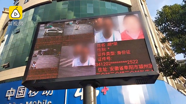中國安徽省的車水馬龍的大馬路上就啟用了「行人闖紅燈抓拍系統」這樣的設備。這個設置會立刻把當下闖紅燈過路人的所有個人訊息,全都顯示在對面街口的大型螢幕看板上,非常引人注目。