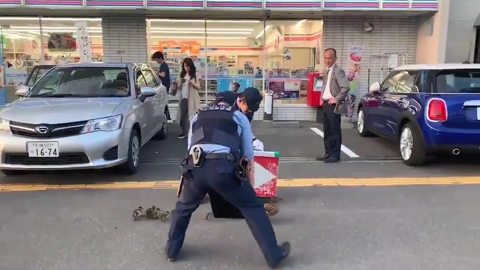 推主近日在網上分享了一段關於警察和動物的超有愛影片,表示在北海道市內的一家便利店外目睹了警察叔叔為鴨母子帶路的畫面,而且當時候還有許多民眾正在圍觀這個情景。據悉,鴨媽媽和孩子們當時候似乎迷了路,而且還身處於便利店外的停車場,於是那2位警察便合力幫助鴨母子一起離開危險的範圍。