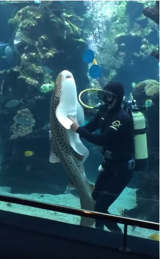 不過這個影片拍攝到的小鯊魚可不是這樣,可以看到牠原本在大型水族缸裡自在的游泳,而一名潛水員正在努力刷洗著這些魚們的家。突然鯊魚不停地靠近這位潛水員。
