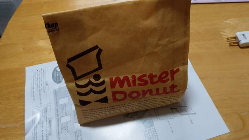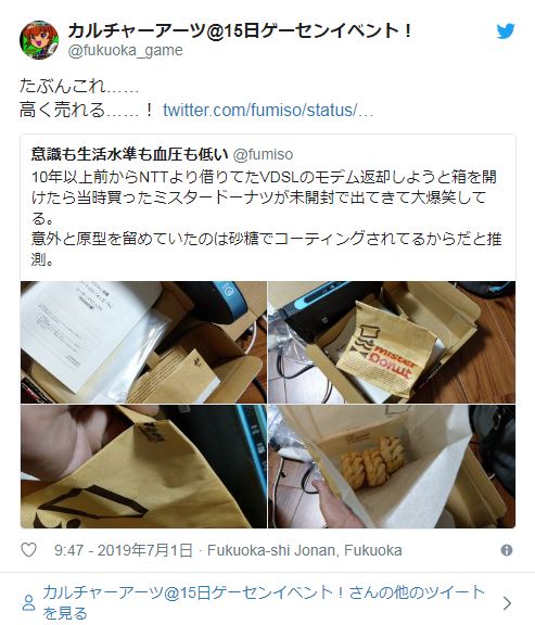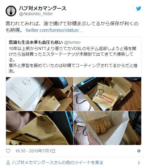 「正準備歸還10多年前跟NTT租借的VDSL數據機而打開箱子,結果竟然發現當時買的Mister Donut還未開封真是笑死我。意外保有原型應該是因為外面有裹砂糖的緣故吧。」
