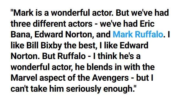 在蒙特簍動漫展上,他對馬克魯法洛發表了這樣的意見,「馬克是很優秀的演員,但現在有了3個完全不同的演員:艾瑞克巴納、愛德華諾頓以、馬克魯法洛。個人來說,我最喜歡比爾·比斯比,也喜歡愛德華諾頓,但魯法洛……他是很棒的演員,能完美融入漫威復仇者中,可是我沒辦法太認真看待他。」
