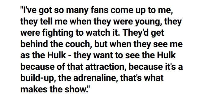「許多粉絲告訴我說,當他們年輕時,會吵著看電視,等著看我化成浩克。他們想看浩克,是因為他的吸引力,有成長的過程,有腎上腺素,這成就了影集好看的原因。」