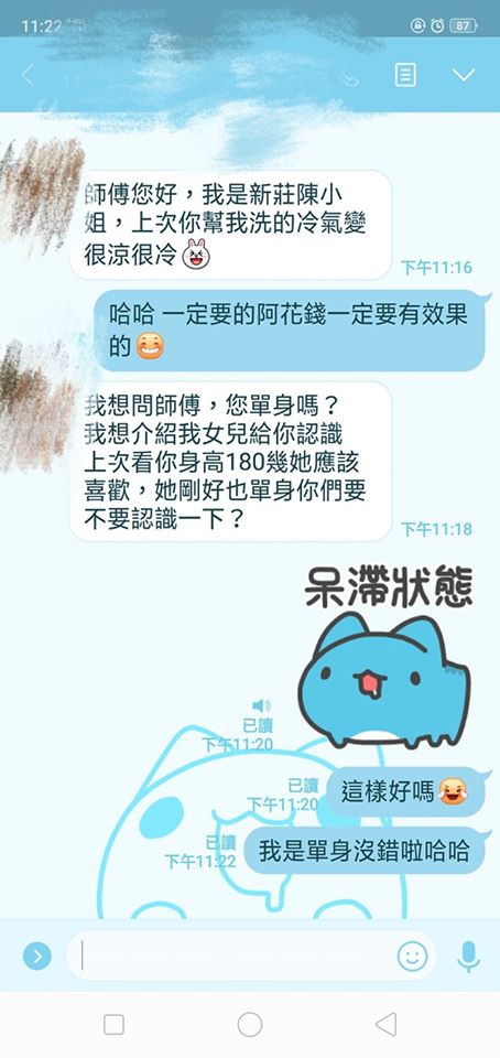 這名冷氣師傅在「爆廢公社」貼出一張對話截圖並寫到「每天去不同客戶家終於有福利?」,只見截圖是他跟一位新莊客戶的對話,對方一開始訊息他「師傅您好,我是新莊陳小姐,上次你幫我洗的冷氣變很涼很冷」,原PO隨後也回覆「哈哈,一定要的阿,花錢一定要有效果的」,這樣看似感謝的訊息卻在下一秒神翻轉,對方接下來竟然寫到「我想請問師傅,您單身嗎?我想介紹我女兒給你認識,上次看你身高180幾,她應該喜歡,她剛好也單身,你們要不要認識一下?」,這樣的提問讓原PO當下不知如何回應,於是便發了一張「呆滯」貼圖給對方,隨後也把這個有趣對話分享到網路上。