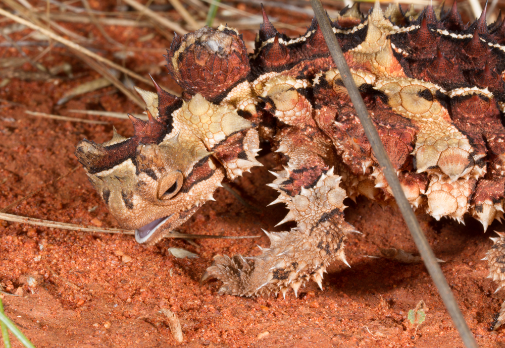 另外,由于沙漠极度缺水,澳洲棘蜥的饮水方式也极为不同,每当夜幕降临时,白天炙热的沙漠变得极为寒冷,空气中的散落的水蒸气在接触到澳洲棘蜥的身体后形成露水。积少成多的情况下,棘蜥皮肤上有数以千计的小凹槽,将水珠吸附全身,牠再用长长的舌头不断舔舐身体,饮用足够维持一天的水量。