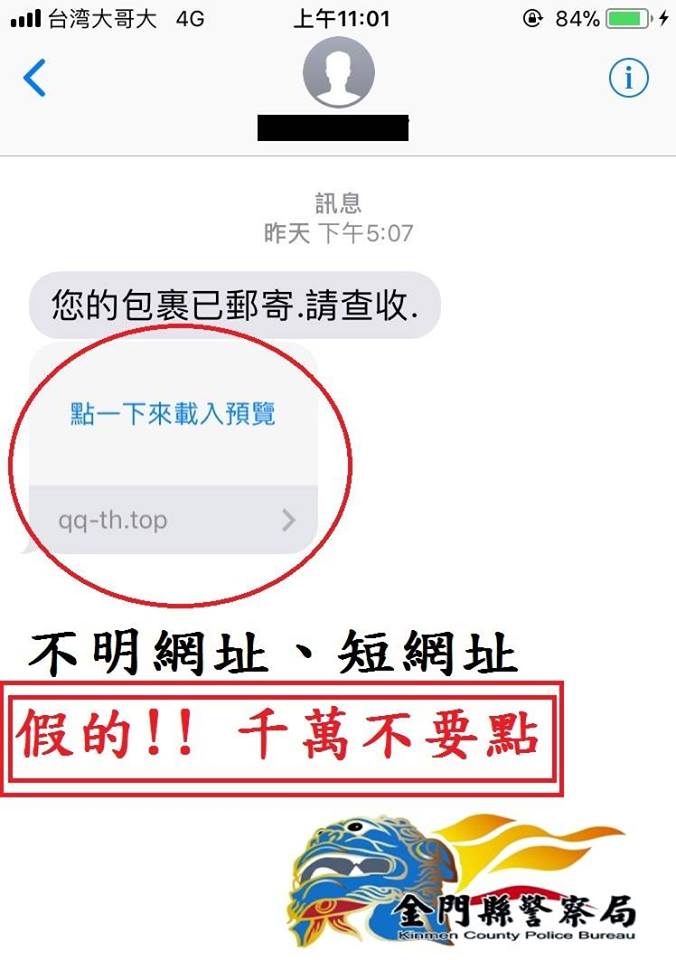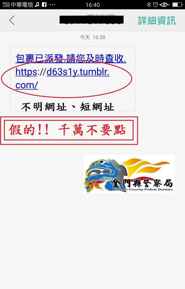 近期金門民眾都不約而同收到「包裏已送報,請查收」的相關簡訊,但金門縣刑警大隊已呼籲民眾不要再誤信這類簡訊以免受騙。縣刑大副隊長董紀宏指出,這類釣魚簡訊是一種新形式的詐騙手法,詐騙集團一開始會佯裝成物流公司並寄送「您的包裏已郵寄,請查收」、「包裏已派發,請您及時查收」等簡訊,而且會內附一串連結網址誘導接收者點擊。由於該網址連結至假的物流公司網站,大家一旦點進去就會跳出下載行動裝置安裝程式 (.apk檔) 頁面,或是要求重新輸入「Apple」或「Google」帳號密碼進行驗證,因為現在有很多人習慣將信用卡綁定手機或一些特定APP,一旦不小心安裝了詐騙的程式,手機內的賬號資訊將會立馬被盜取。