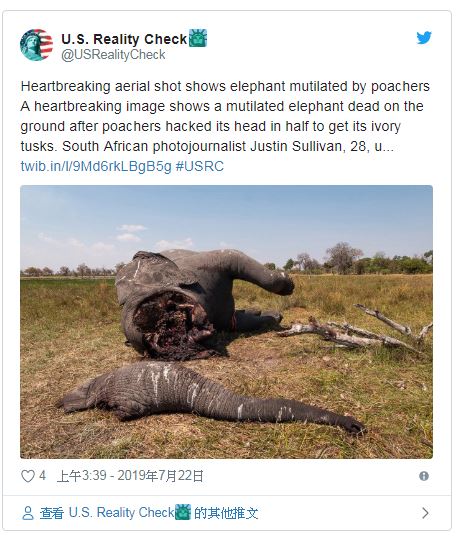 内阁部长还在报告中指出,现在大象的数量太多了,已经影响到人类的活动范围,而且农作物常常会被大象践踏。28岁的纪录片导演贾斯汀当时正在非洲开普敦拍电影 (Justin Sullivan) 因为当时正逢打猎季节所以他决定要乔装前往猎象地点,他使用了空拍机拍摄非洲大草原,结果居然拍到很多具大象遗体,更有大象整张脸被直接切掉的画面,因为这样比较方便把象牙拿下来……。而且据动保团体统计,从2017年到2018年为止,已经有超过400只大象遭遇到这么残酷的事情。