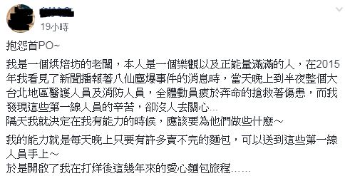 有一句大家都熟悉的話,台灣最美的風景是人。許多人都會發揮愛幫助有需要的人,有一名網友在爆怨公社上PO文表示自己是一個烘培師,從八仙塵爆事件後開始送醫院以及消防單位愛心麵包,持續了4年,但是現在因為收入問題沒有辦法繼續送麵包,希望能用自己正能量影響更多人