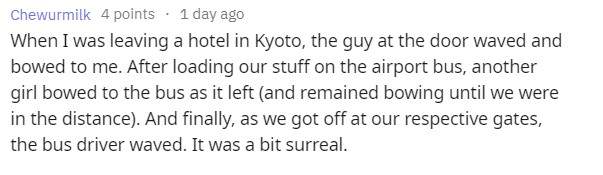 有网友提到了自己在其它方面的亲身体验「我离开京都一间饭店的时候,门口有人跟我鞠躬挥手,把我们的行李放上通往机场的巴士后,另外一位女孩也对着离开的巴士鞠躬 (当我们已经离开一段距离后她仍然低着头),随后我们终于在各自的登机门下车时,司机也向我们挥手,这真的有点超乎现实」。