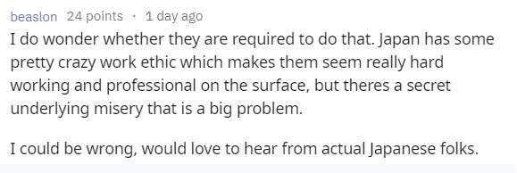 「我很好奇他们是被强制要这样做吗?日本人的工作伦理有时候还蛮疯狂的,他们看起来很认真工作也充满专业性,但私下的悲惨面才是真正的问题。我也许是错的,所以希望能听听日本人的意见」。
