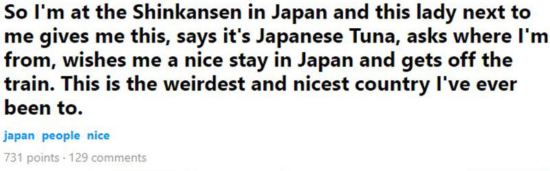 網友在社群網站9GAG上發文「我在日本的新幹線上,隔壁的女士給了我這個,她說這是日本鮪魚,問了我從哪來,然後祝我在日本玩得愉快就下車了,這真是我去過最古怪和最棒的國家。」