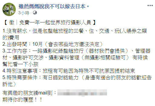 記錄台日異國戀的高人氣粉專「雖然媽媽說我不可以嫁去日本」於1日在臉書貼文徵人,表示想要找一位可以跟原PO夫妻環遊世界1年的隨行攝影師,除了沒有薪資之外,其它費用幾乎全包,而工作內容則是包括攝影師需要一路攝影和記錄旅程、搬運器材、管理器材、處理攝影許可,偶爾也要幫忙照顧小孩,而且還要具備日語對話能力。除此之外,該專頁也強調可以沒有攝影經驗,出發的日期預計是10月,「沒有薪水,但是包整趟旅程的三餐、住、交通、玩 (入場券之類的) 費用」。