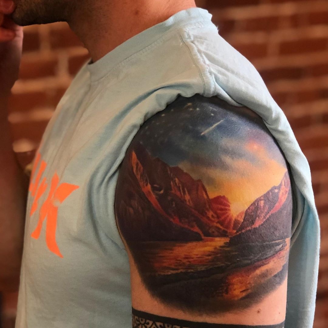 他也会把一些有名的景点画面刺在客人的手臂上,就连配色都完全一致。
