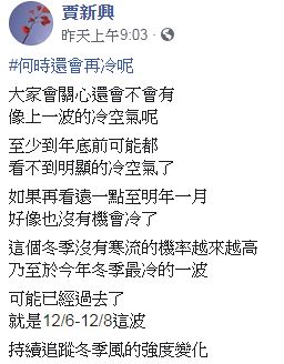 然後發現未來兩個月都沒有冷空氣,表示「最冷的時刻已經過去了。」從年底到1月都沒有什麼明顯的冷空氣,不過他也說,他還需要持續追蹤季風的變化。