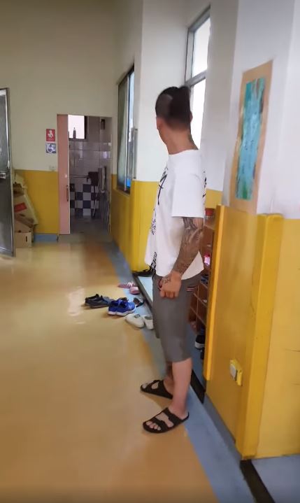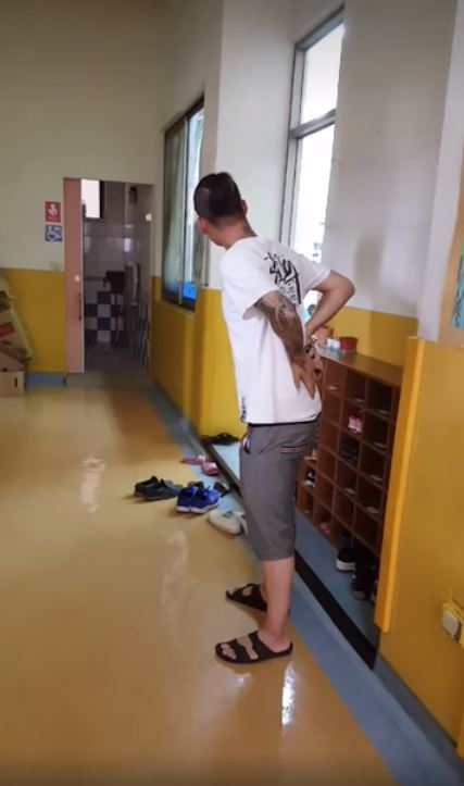 從畫面中可見,當老爸把女兒送進教室以後,為了不被女兒發現,於是偷偷躲在教室門口,超爆笑的畫面全被老婆捕捉下來,表示「像個變態大叔,重點一站還站了快一小時!」即便老婆一直勸他離開,但他還是堅持站在原地不肯離開,似乎真的捨不得女兒。