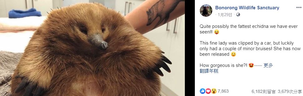 波諾朗保護區也在FB發文表示「這隻是我們看過有史以來最胖的針鼴,這隻美麗的女士被車夾住,不過幸運的是只有一點點瘀青,現在已經被野放了!(對了,牠現在被打了鎮定劑) 。