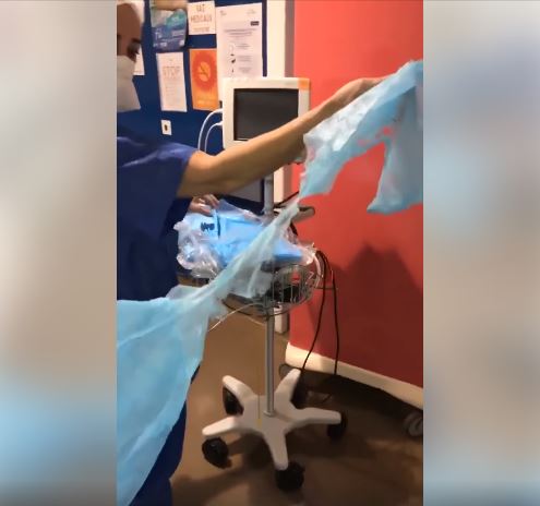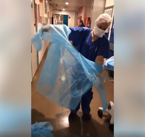 一名醫護人員試圖穿上時,手才一穿過袖口,防護衣就應聲碎裂,他無奈拍掉手上的防護衣碎屑後轉身離去,徒留地上的防護衣碎屑。