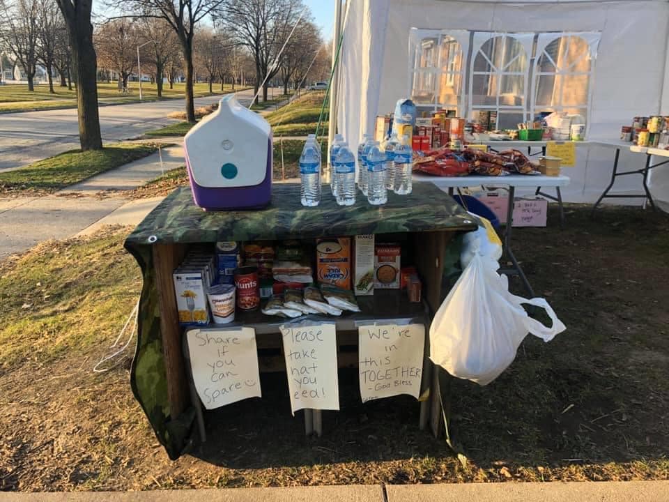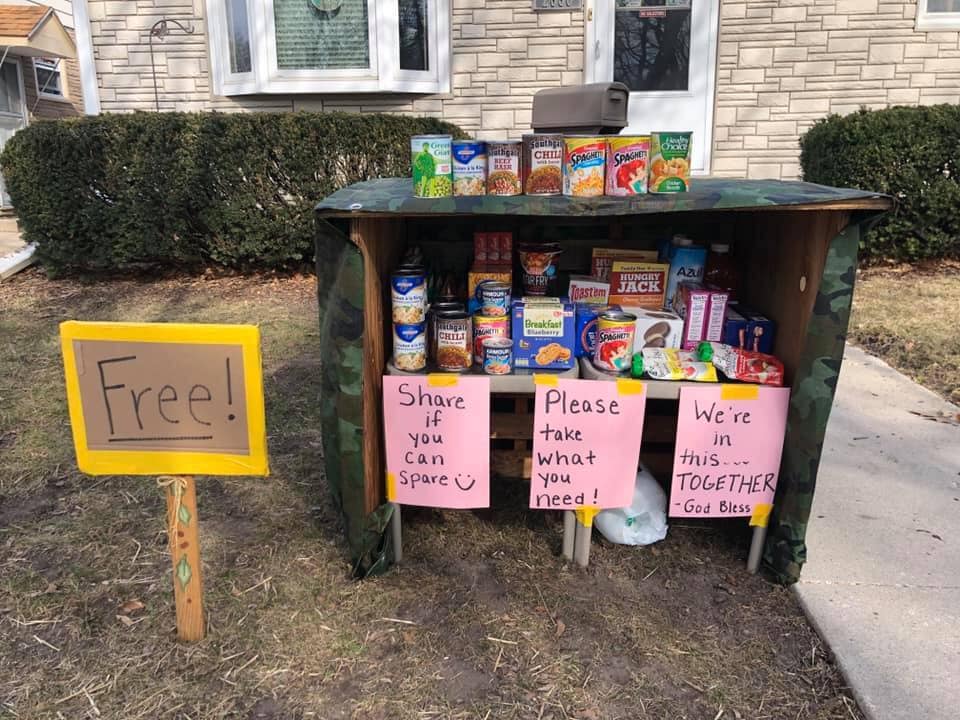 住在美国威斯康辛州密尔沃基市 (Milwaukee, Wisconsin) 的泰莉乌利微高尔 (Terry Uribe Gall) 和她的家人希望可以尽自己所能地帮助他人,所以在家中的庭院设立了一个食物补给站,让邻居们如果有缺少什么东西的话,可以来这边索取。不过她也订下了规矩,希望大家只拿自己真正需要的东西,也欢迎大家加入行列分享自己多出来的物资,共同一起度过难关。