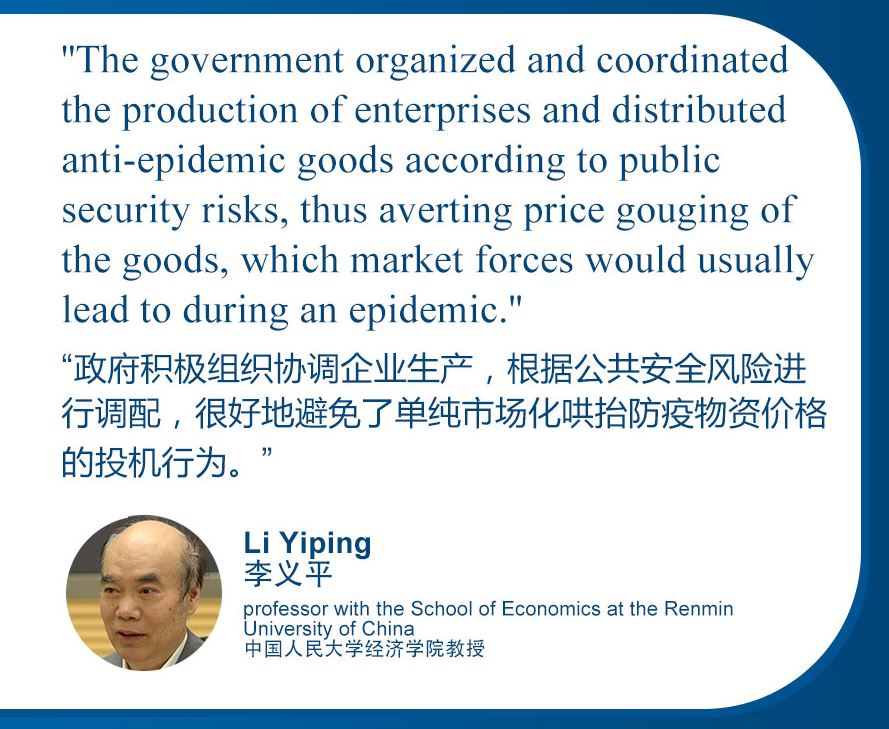 「政府層級組織協調企業生產,根據公共安全風險進行調配,很好地避免了單純市場化哄抬防疫物資價格的投機行為。」–中國人民大學經濟學院教授李義平