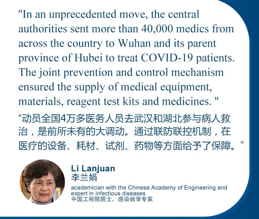 「動員全國4萬多醫療人員去武漢和湖北參與病人救治,是前所未有的大調動。通過聯防聯控機制,在醫療的設備、耗材、試劑、藥物等方面給予了保障。」–中國工程院院士、感染病學專家李蘭娟