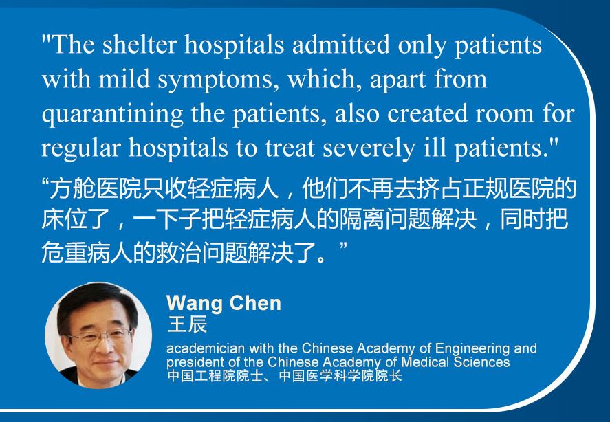 「方艙醫院只收輕症病人,他們不再去擠佔正規醫院的床位了,一下子把輕症病人的隔離問題解決,同時把危重病人的救治問題解決了。」–中國工程院院士、中國醫學科學院院長王辰