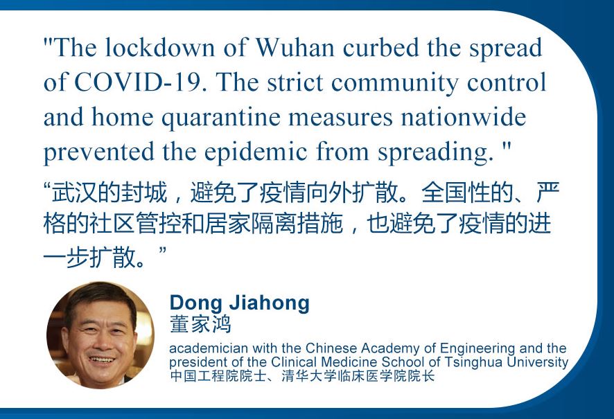 「武漢的封城,避免了疫情向外擴散。全國性的,嚴格的社區管控和居家隔離措施,也避免了疫情的進一步擴散。」–中國工程院院士、清華大學臨床醫學院院長董家鴻