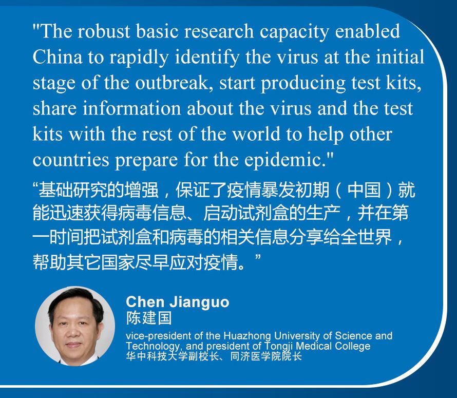 「基礎研究的增強,保證了疫情爆發初期(中國)就能迅速獲得病毒信息、啟動試劑盒的生產,並在第一時間把試劑盒和病毒的相關信息分享給全世界,幫助其他國家提早應對疫情。」華中科技大學副校長、同濟醫院院長陳建國