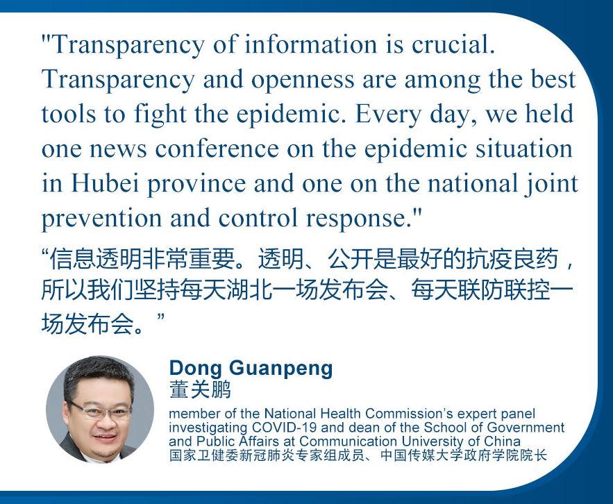 「信息透明非常重要。透明、公開是最好的抗疫良藥,所以我們堅持每天湖北一場發布會、每天聯防聯控一場發布會。」–中國傳媒大學政府學院院長董關鵬