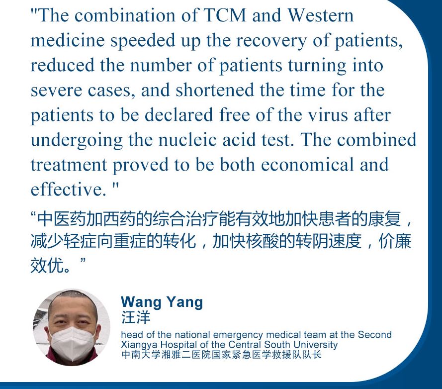 「中醫藥加西藥的綜合治療能有效地加快患者的康復,減少輕症向重症的轉化,接快核酸的轉動速度,價廉效優。」–中南大學湘雅二醫院國家緊急醫學救援隊隊長汪洋